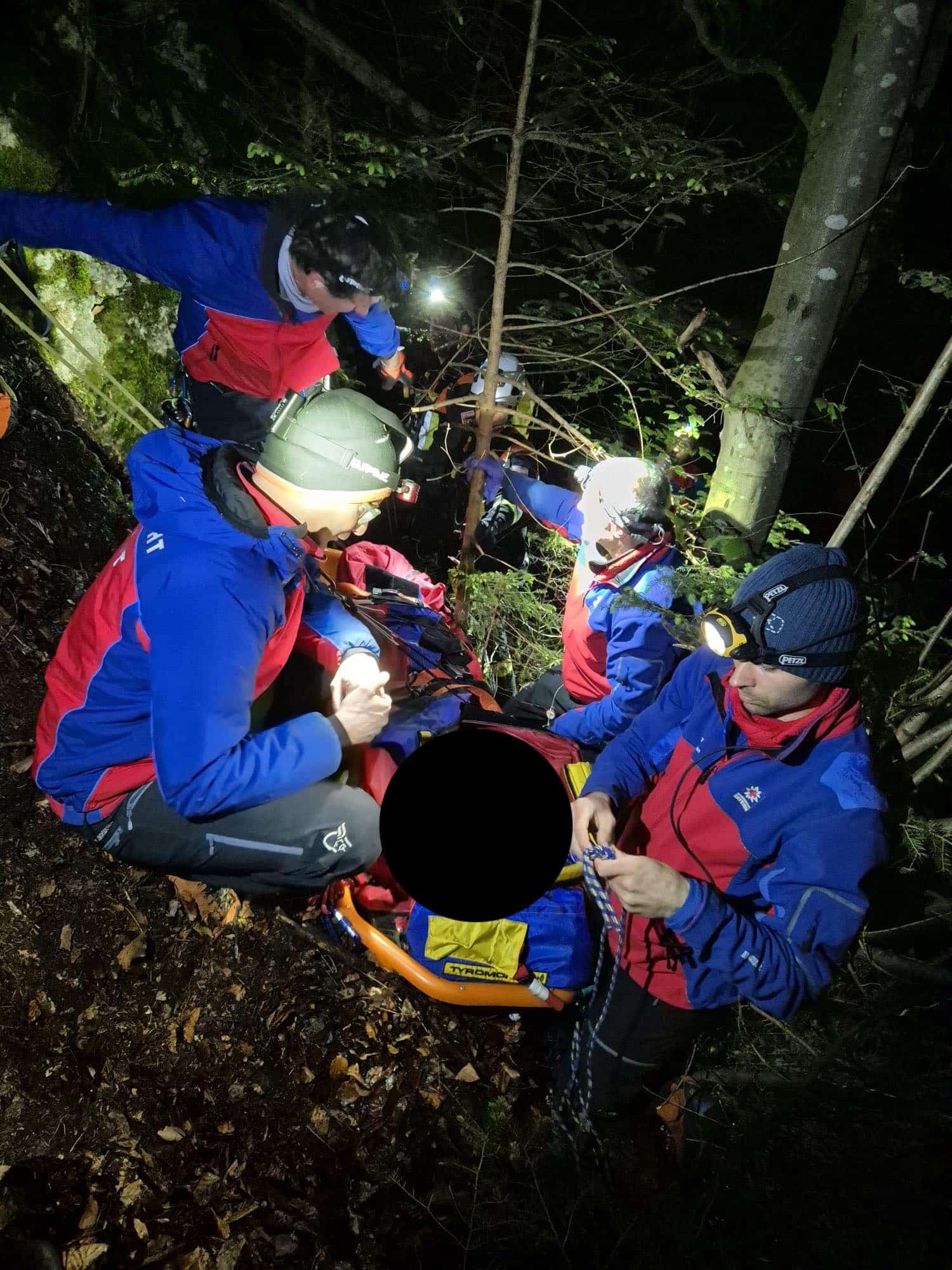 Unmittelbar nach Eintreffen am Einsatzort begaben sich Einsatzkräfte der Feuerwehr und der Bergwacht mit Absturzsicherungsmaterial sowie Beleuchtungsausrüstung in das Gelände zum Verunfallten. Der Notarzt der Bergwacht Füssen übernahm umgehend die medizinische Erstversorgung des Patienten. Aufgrund eines vermuteten Wirbelsäulentraumas wurde der Verunfallte vollständig immobilisiert.
