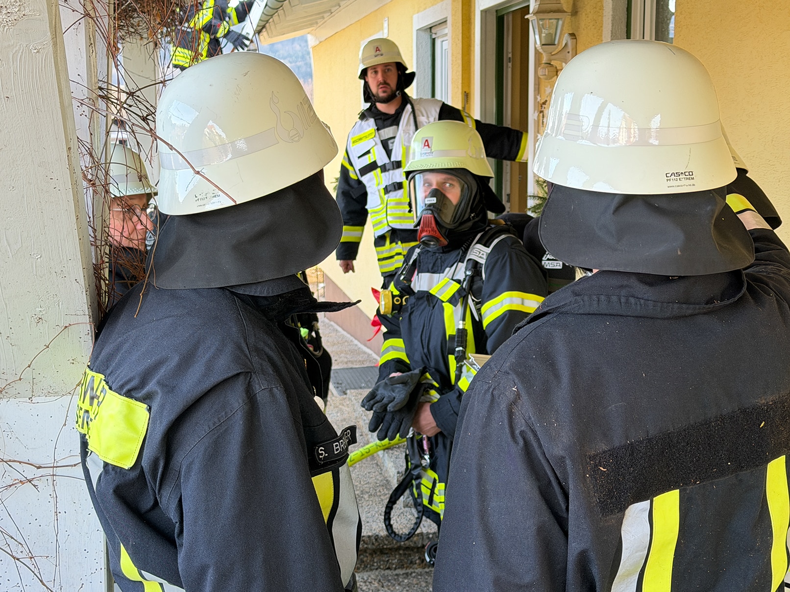 Bei der ersten Erkundung war die Wohnungstür verschlossen. Um eine Lageeinschätzung vorzunehmen, wurde über eine Steckleiter das Fenster der betroffenen Wohnung kontrolliert. Von außen waren keine Anzeichen für einen Wasserschaden erkennbar.
