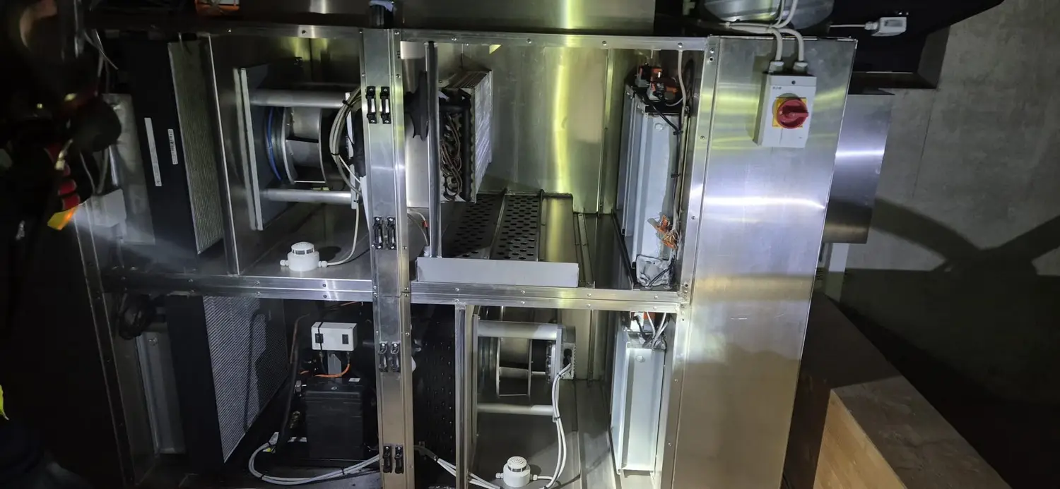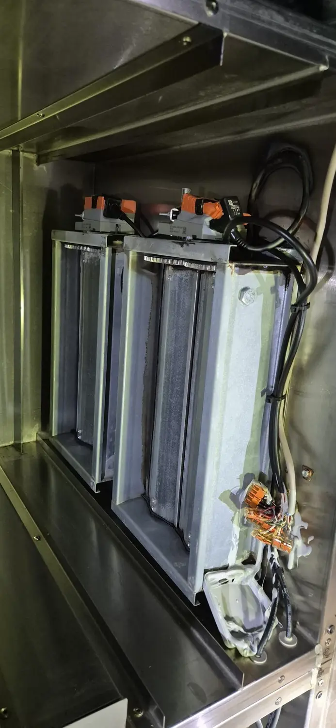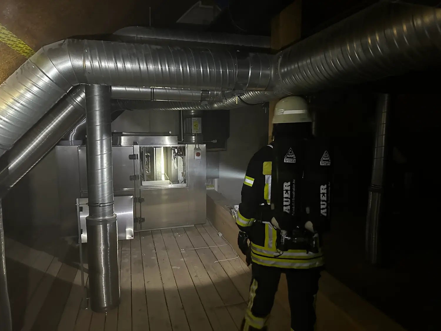 Ein Atemschutztrupp ging zur Erkundung in das Dachgeschoss vor. Dort konnte kein offenes Feuer festgestellt werden, jedeoch eine überhitzte Lüftungsanlage. Die Anlage wurde zunächste stromlos geschaltet und anschließend geöffnet. Im inneren stellte sich ein Elektrobrand als Ursache heraus. Dieser wurde mit eim CO²-Löscher erfolgreich abgelöscht.