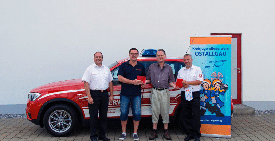 Sponsoring Jürgen Brecht spendet an die Kreisjugendfeuerwehr OAL und den Feuerwehrverein Am Freitag, 18.08.2017 überreichte Jürgen Brecht Kreisjugendfeuerwehrwart Klaus Grosch, im Beisein von Kreisfeuerwehrverbandsvorsitzenden Markus Barnsteiner, für die Kreisjugendfeuerwehr Ostallgäu eine Spende in Höhe von 1.111,00 EUR. Unser Feuerwehrverein erhielt zur Nachwuchsförderung ebenfalls 1.111,00 EUR von Jürgen Brecht. Die Spende nahm unser Vereinsvorsitzender Gerhard Ruf entgegen. Herzlichen Dank an Jürgen Brecht für die großzügigen Spenden. Andreas Haust (Vorsitzender Wasserwacht Roßhaupten) und Hannes Bruckdorfer (Bereitschaftsleiter Bergwacht